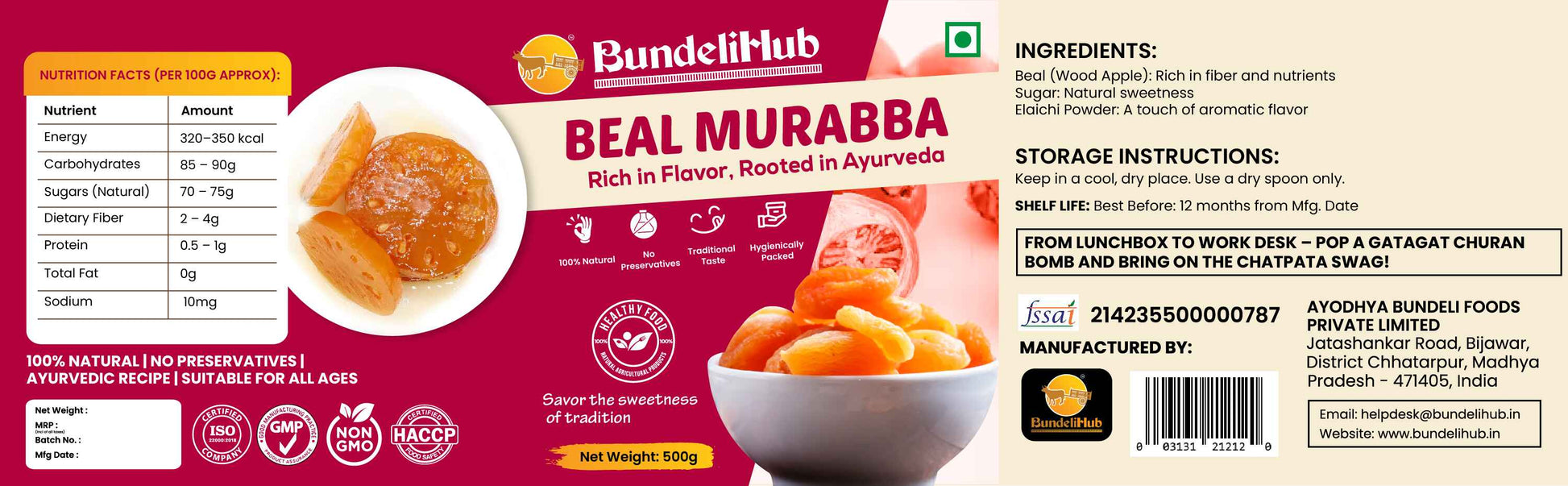 Manufactured by: Ayodhya Bundeli Foods Pvt. Ltd., Chhatarpur, MP