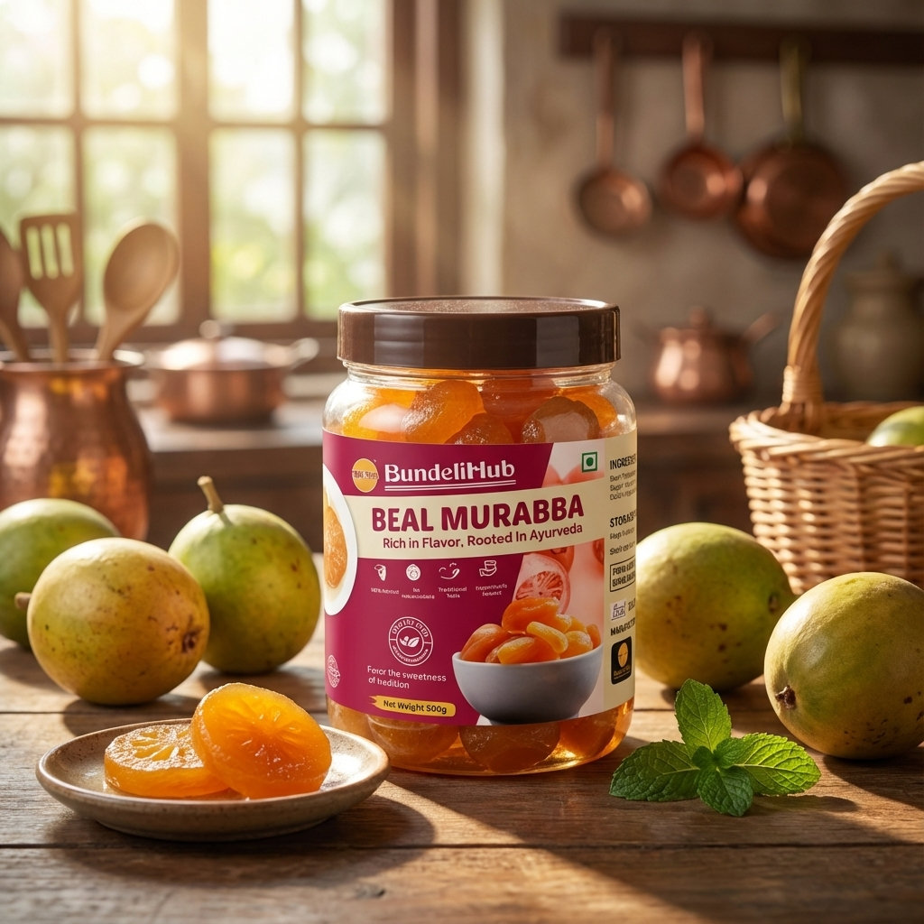 Bundeli Hub presents Beal Murabba, a traditional sweet preserve prepared from carefully selected bael (wood apple) fruit. Crafted using time-honoured methods, it offers a rich taste, natural sweetness, and authentic homemade quality.